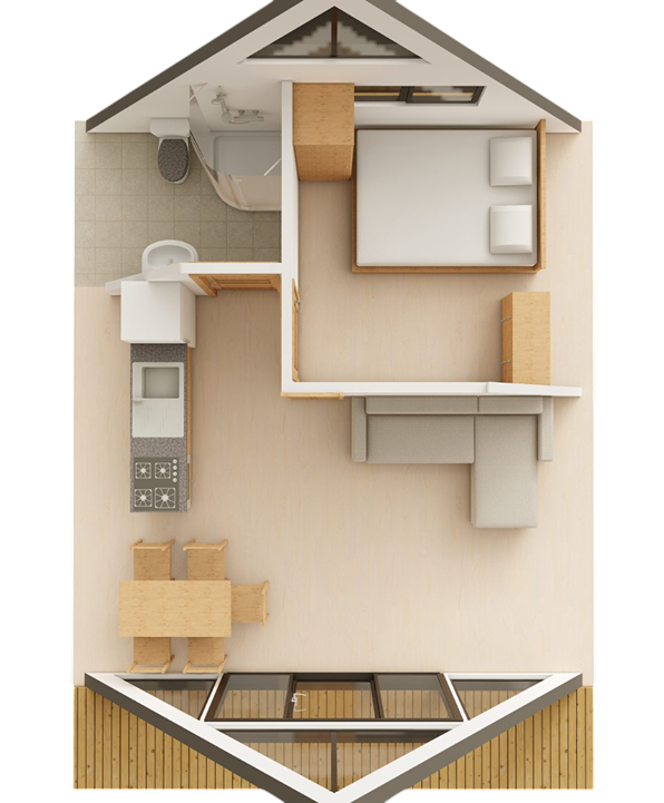На першому рівні розміщується кухня-студія, санвузол та спальне місце. Відкрите планування дозволяє зручно зонувати простір під ваші потреби — від відпочинку до повсякденного життя.